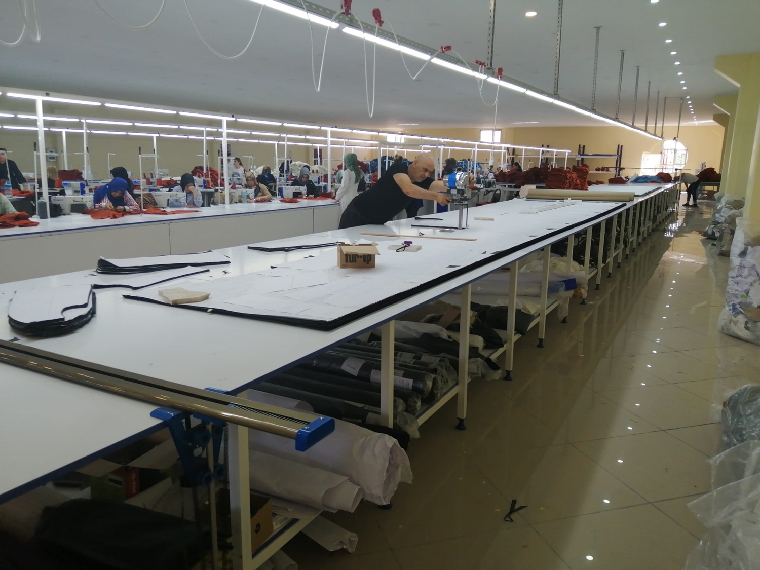 Kesimhanemizde 30 metre hava destekli tezgahlarımız mevcuttur. Kumaş parçalı desen kağıdı, doğru kesim sağlamak için kumaş yığınının üzerine sabitlenir ve uygulanır.